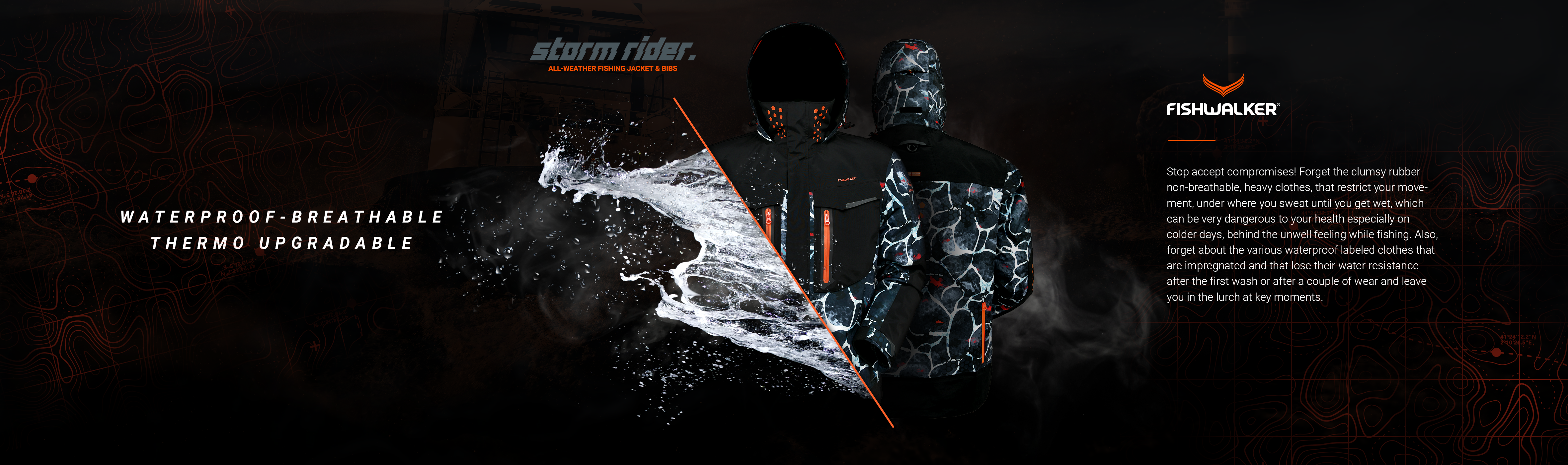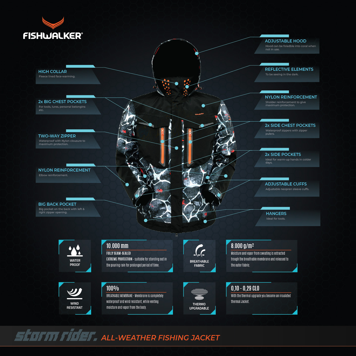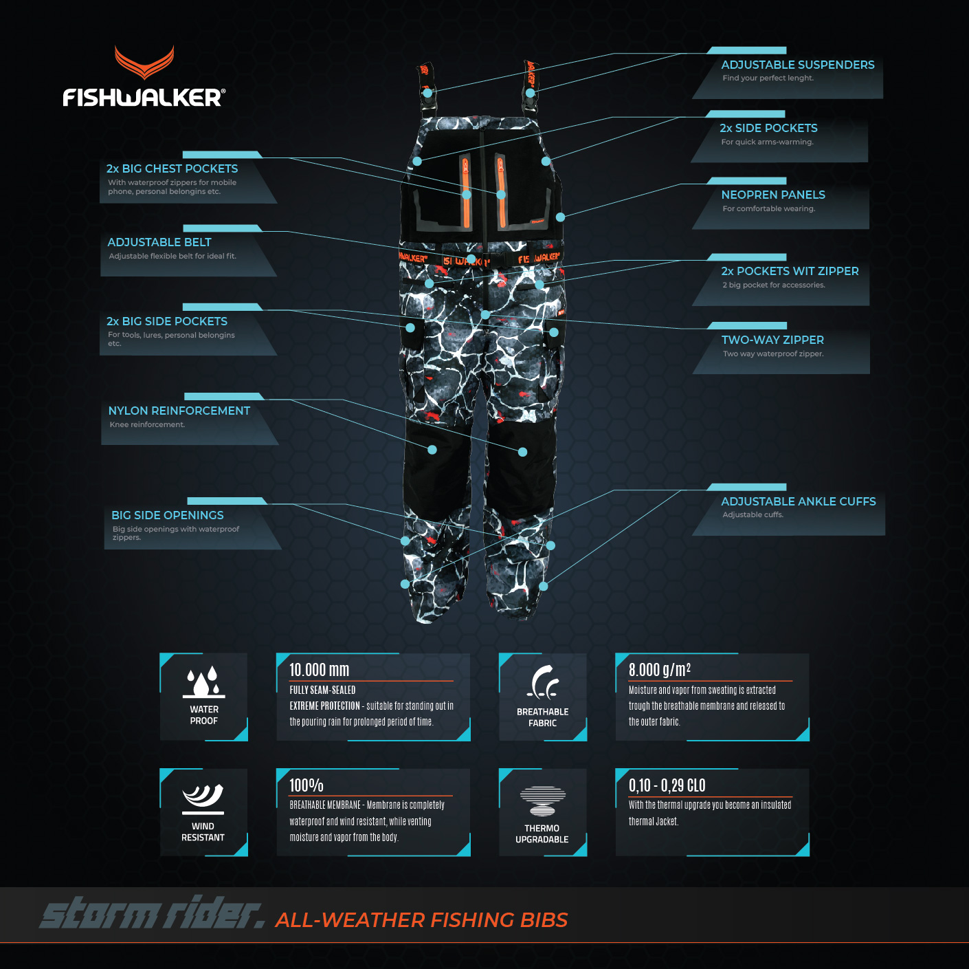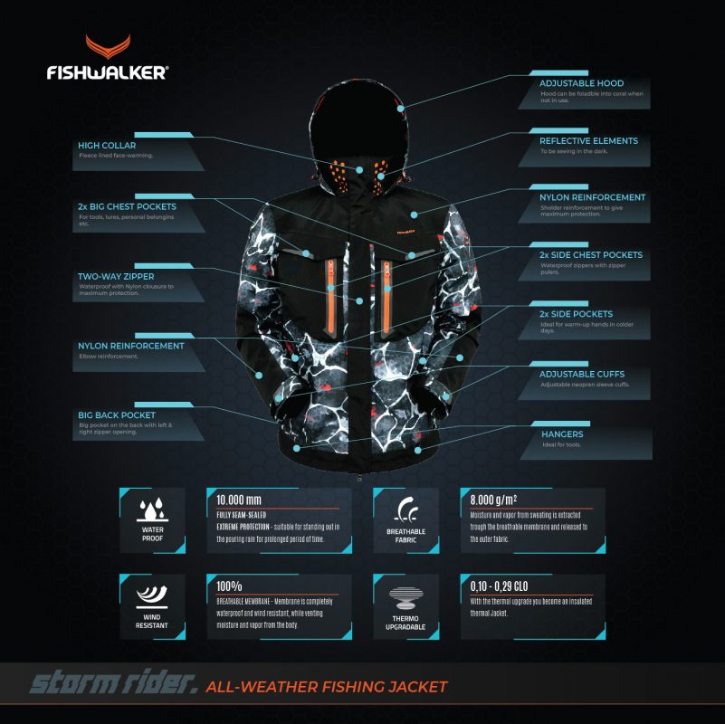 Fishwalker STORM-RIDER All-weather jakna in bibs-i sta izdelani posebej za ribolov tudi v najtežjih vremenskih pogojih. Izdelana sta iz lahke, nepremočljive in paropropustne 3 slojne taslan 30D tkanine z TPU laminacijo kar zagotavlja popolno zaščito pred ekstremnimi elementi tudi v dneh, ko drugi lahko samo sanjajo o ribolovu! STORM-RIDER All-weather jakna in bibs-i vam nudita zaščito pred dežjem in vetrom pri tem pa nudita komfortni občutek zračnih oblačil pod katerimi vam ne bo nikoli prevroče, kjer se ne boste nikoli prepotili pri tem pa vam omogočata prosto gibanje pri muharjenju, spinningu, krapariji oz. ali ste morski ribič iz čolna ali obale.